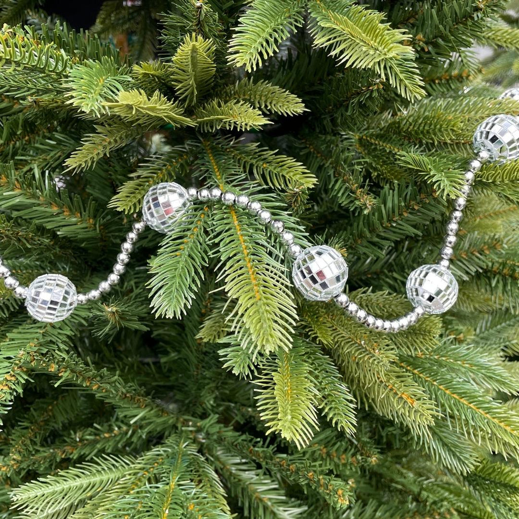 Create a dazzling display this season with this Christmas Garland featuring Silver Disco Balls. Designed to catch the light beautifully, each mirrored sphere reflects a shimmering sparkle that instantly transforms your space into a festive celebration. Inspired by the iconic disco era, this garland adds a touch of nostalgic charm and retro glamour to your Christmas décor.