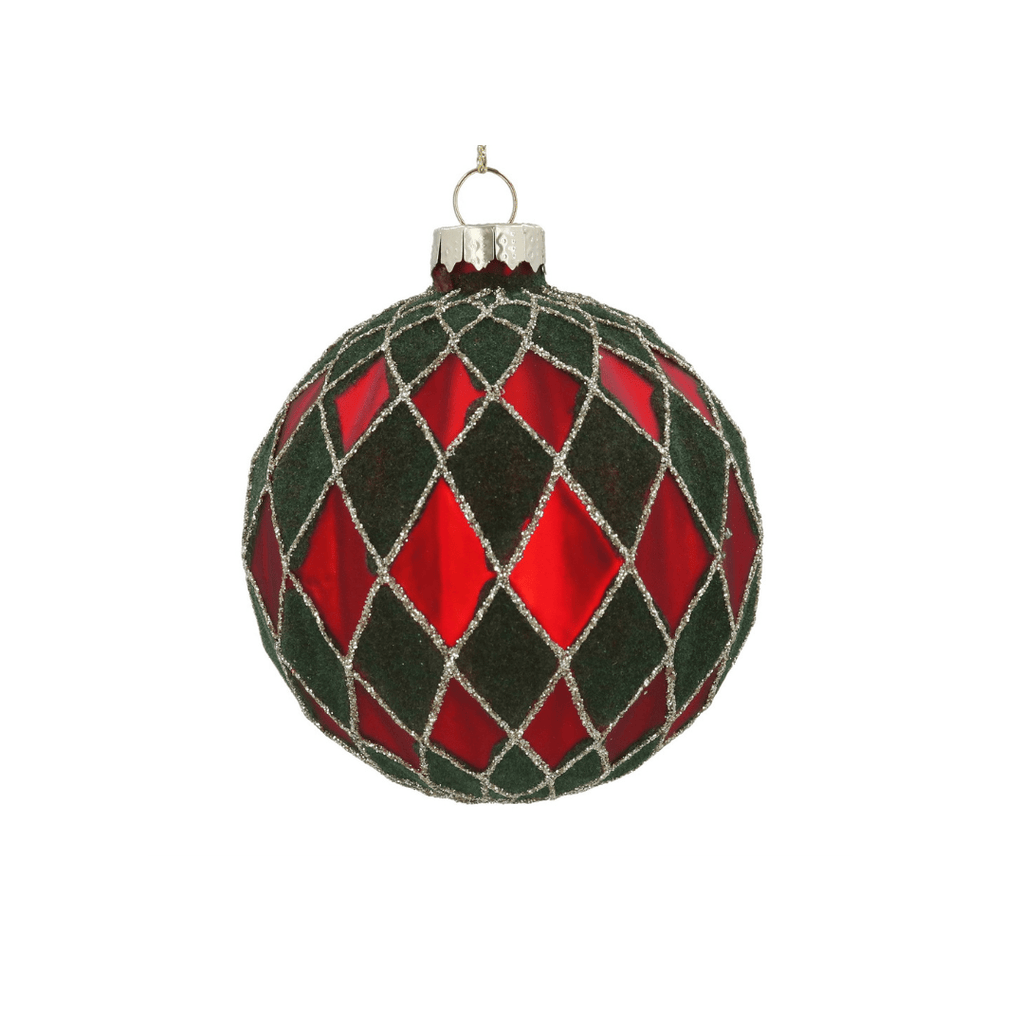 Expertly crafted from glass, this beautiful 8cm bauble features an intricate red harlequin pattern over green flock detailing, creating a design that catches the light beautifully. Whether used as a statement piece or part of a coordinated display, it adds depth and elegance to any festive setting.