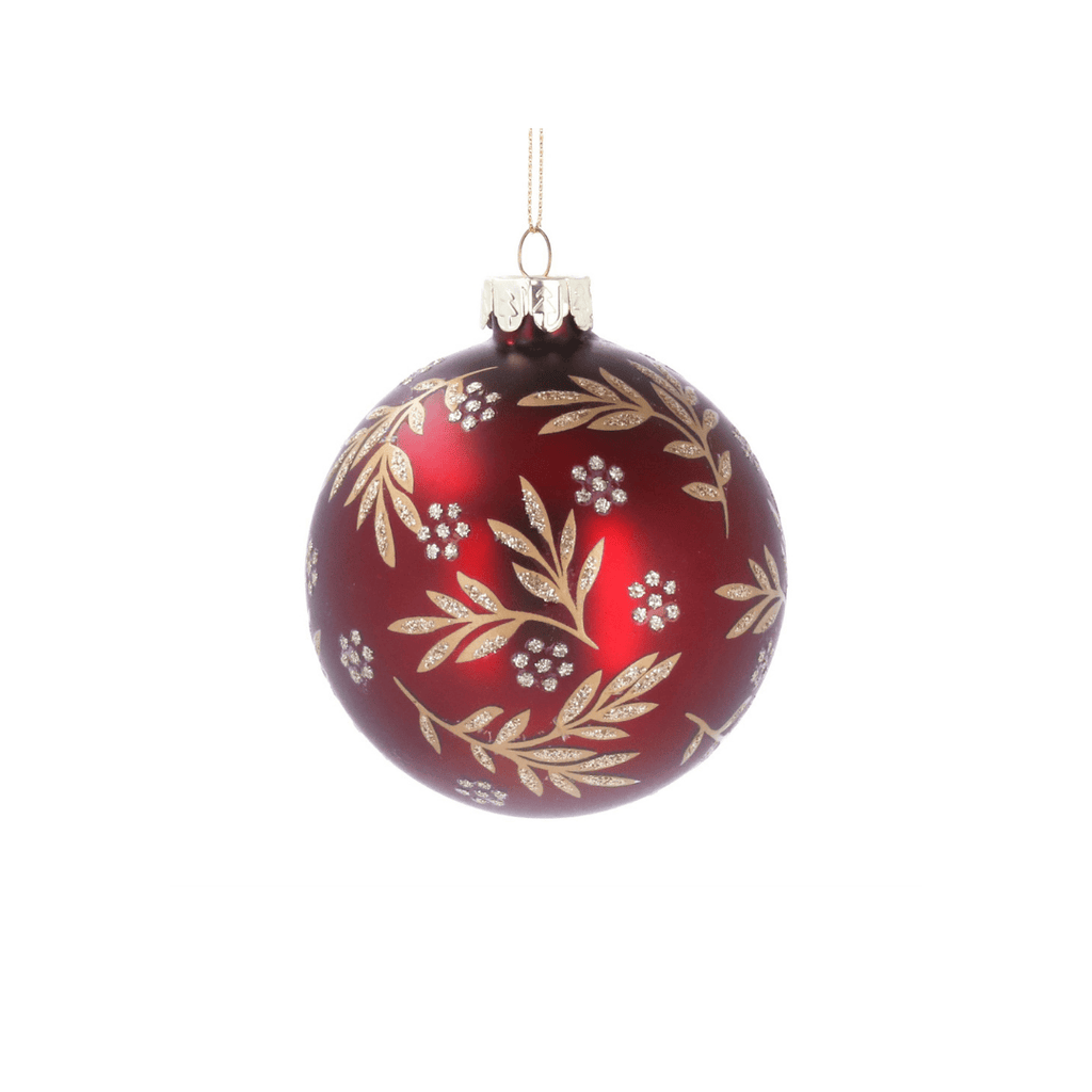 Elegant matt red glass bauble with intricate gold leaf spray design