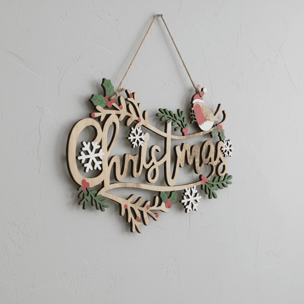 Add a cheerful finishing touch to your festive décor with this ‘Christmas’ Hanging Decoration. Crafted from high-quality plywood, it features charming seasonal details including snowflakes, holly, and a robin, all surrounding the word Christmas in beautifully cut lettering.