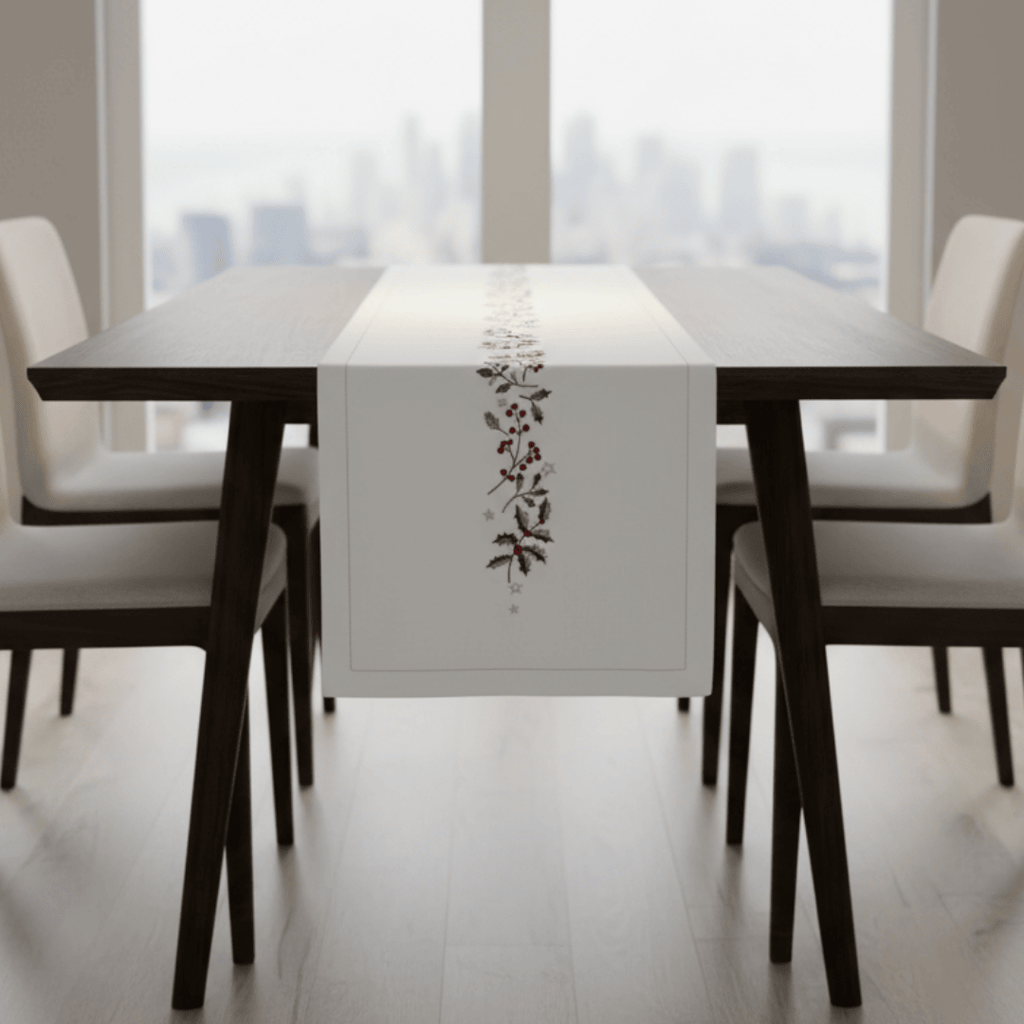 Bring seasonal charm to your dining table with the Christmas Table Runner 'Berry Fall'. Featuring a crisp white base adorned with elegant green foliage and rich red berries, this runner captures the warmth and beauty of the festive season.