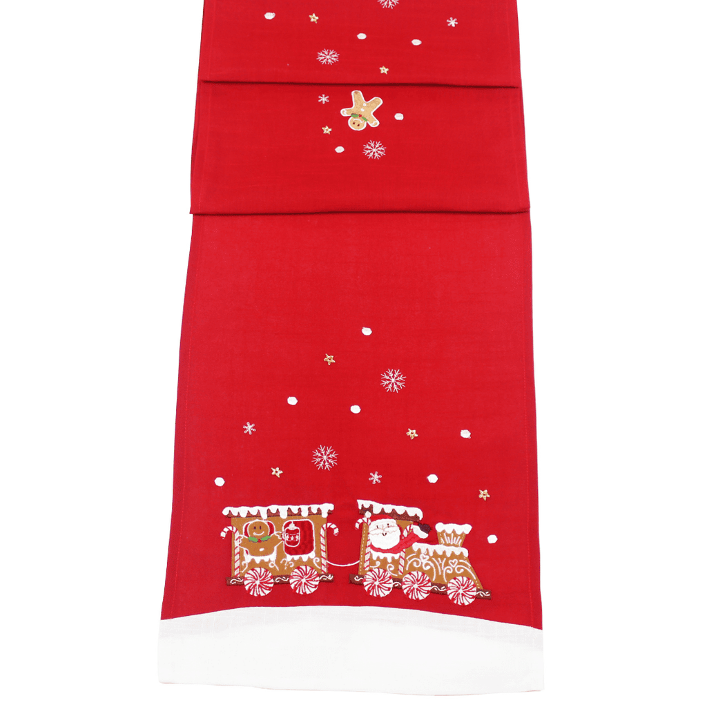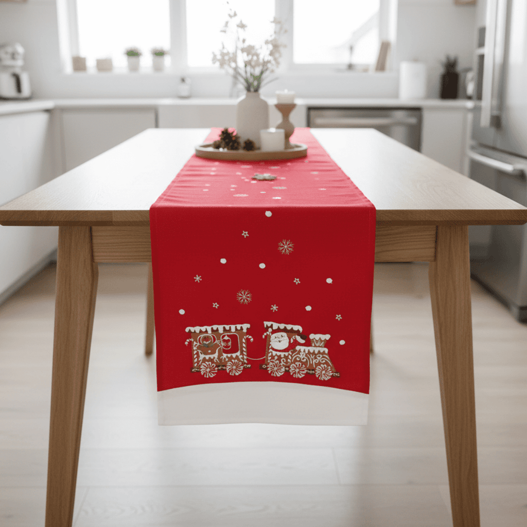 Add charm and playfulness to your festive dining with the Christmas Table Runner ‘Gingerbread Train’. Featuring a delightful appliqué gingerbread train, this runner is designed to bring warmth, joy, and seasonal character to your table setting.