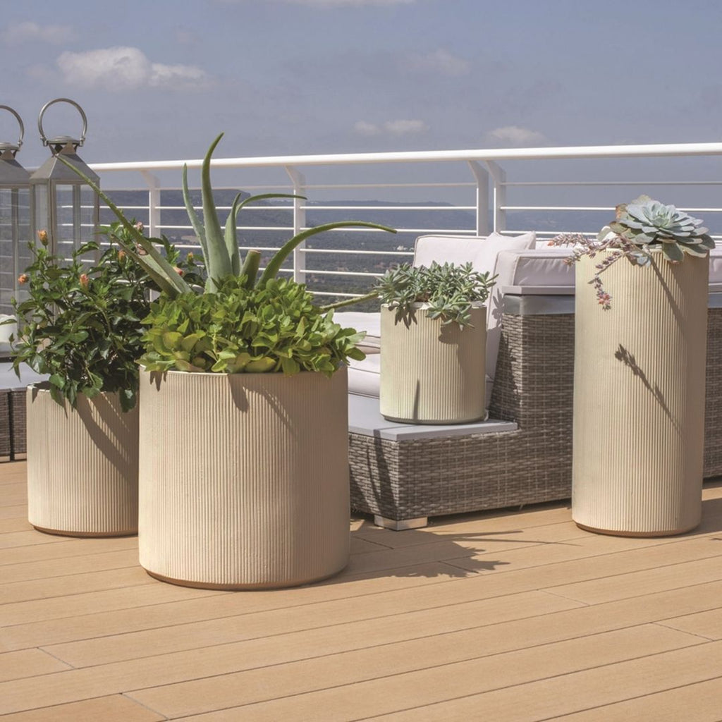 The City Cylinder Pot is a lightweight cylindrical plant pot designed for modern indoor and outdoor spaces. Made in Italy by Vasar, this durable plastic planter features a clean, linear profile that suits contemporary homes, patios and gardens. Its tall, cylindrical shape makes it ideal for statement plants, structural foliage and small trees.
