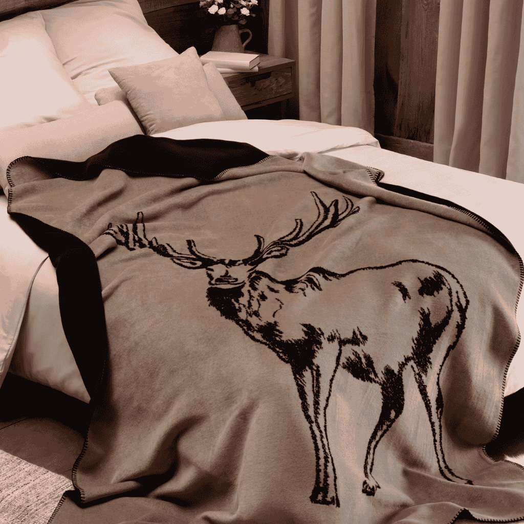 Bring timeless style and comfort into your home with the Deer Throw Blanket from Biederlack. Designed in a modern Alpine style, this cosy blanket features a stately stag motif on a double-face background in chic black and harmonious light brown. Its elegant yet natural look makes it the perfect addition to any interior, whether draped across a sofa, armchair or bed.