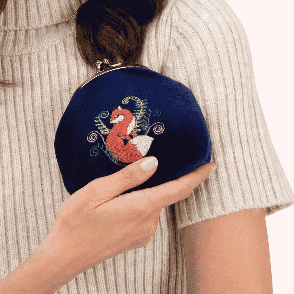 Keep your essentials safe in style with the Elegant Fox Velvet Coin Purse. Crafted in rich navy velvet, this charming purse features a beautifully embroidered fox design that adds a touch of whimsy and character to your everyday accessories.