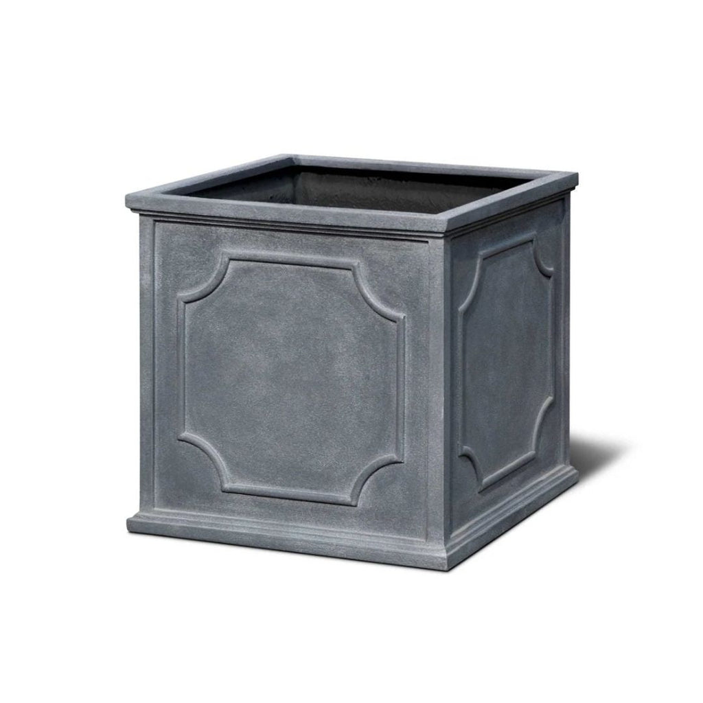 This square outdoor planter features a refined raised panel design on each side, framed with subtle moulded edges and curved corner accents. The result is a sophisticated, structured look that adds depth and character to any planting display.