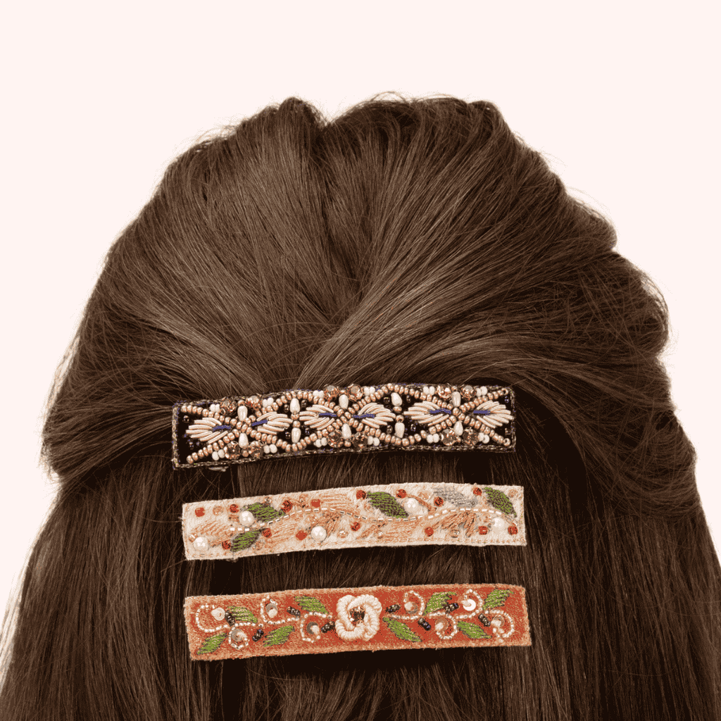 The combination of soft velvet and delicate beading makes this barrette both practical and stylish. Whether you have long, unruly hair or shorter, sleek styles, it holds securely while adding a refined finishing touch to your outfit.