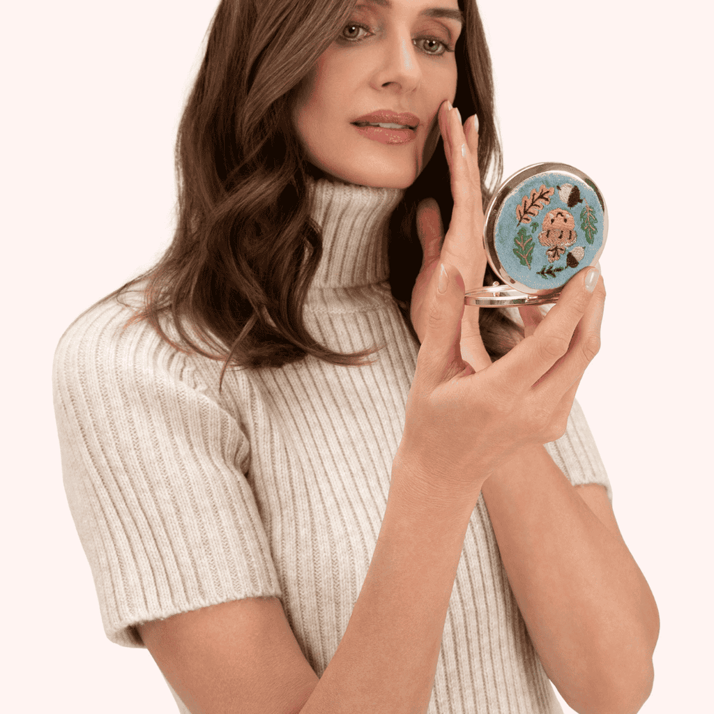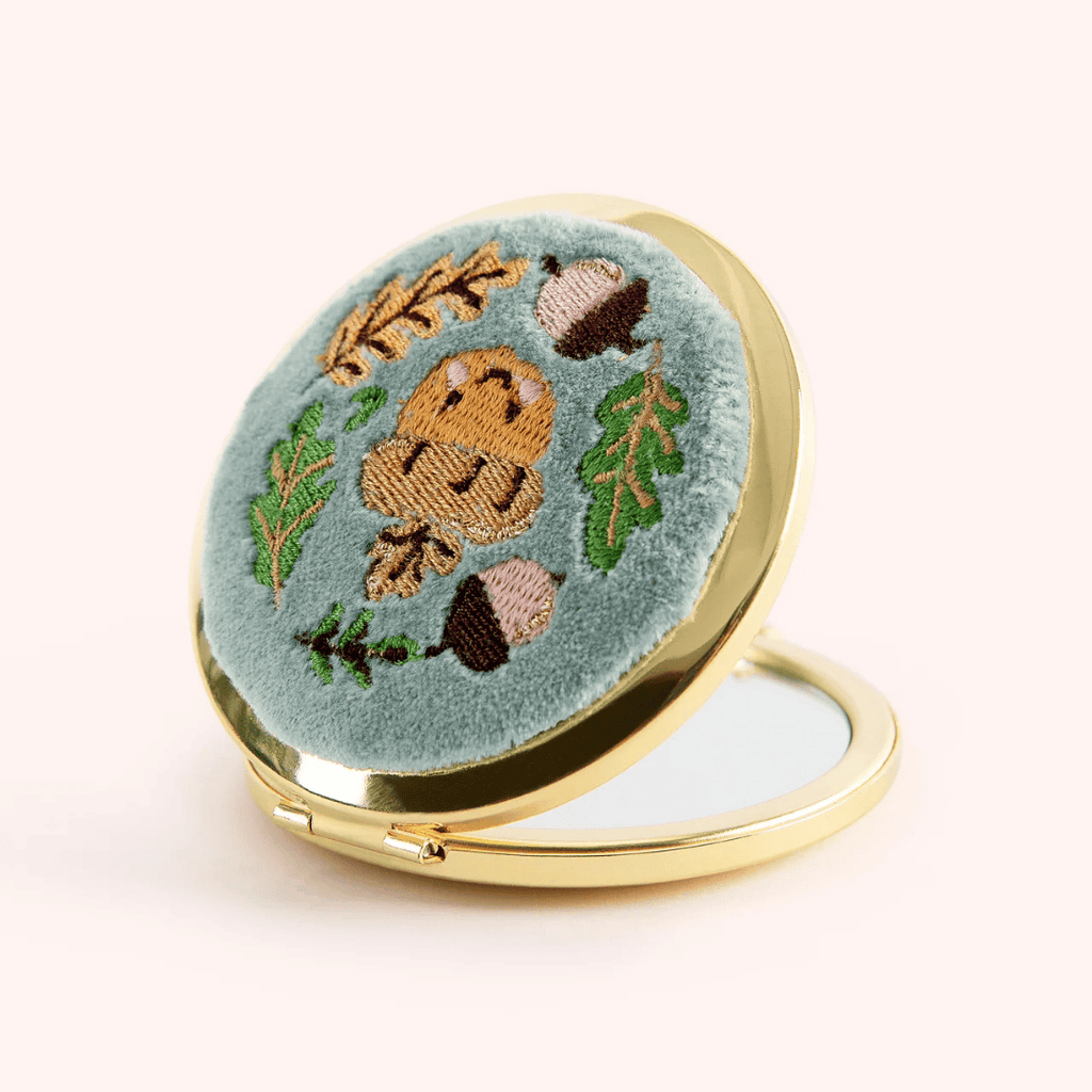 Keep your style in check wherever you go with the Powder Happy Acorn Embroidered Mirror. Designed with a soft velvet outer and charming embroidered acorn motif, this compact mirror is as practical as it is beautiful.