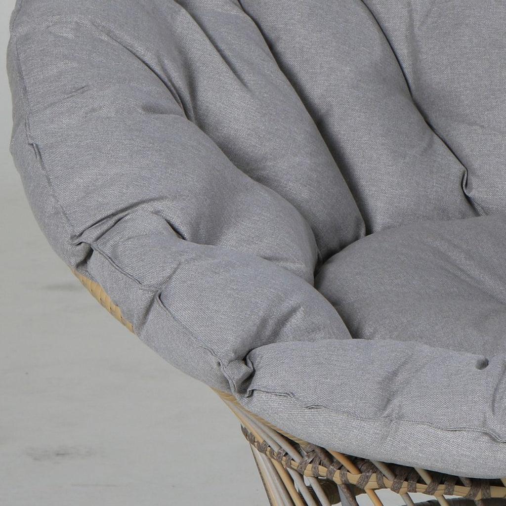 The generously sized seat is topped with a deep, plush grey cushion, offering exceptional comfort for relaxing, reading or entertaining outdoors. Whether styled as a standalone statement piece or paired with a matching outdoor furniture set, this swivel chair brings both movement and comfort to your space.