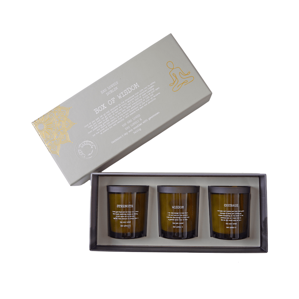 Discover the perfect gift with the Box of Wisdom Scented Candle Gift Set from Eau Lovely Dublin. This limited edition trio of soy wax candles is designed to inspire strength, wisdom, and courage through positive affirmations and beautiful gemstones.