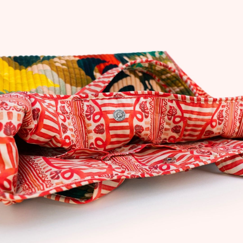 Featuring an intricate botanical leaf print inspired by rainforest foliage, this statement velvet tote bag adds distinctive style to any outfit. The quilted construction provides structure and durability, while the spacious interior ensures plenty of room for daily essentials.