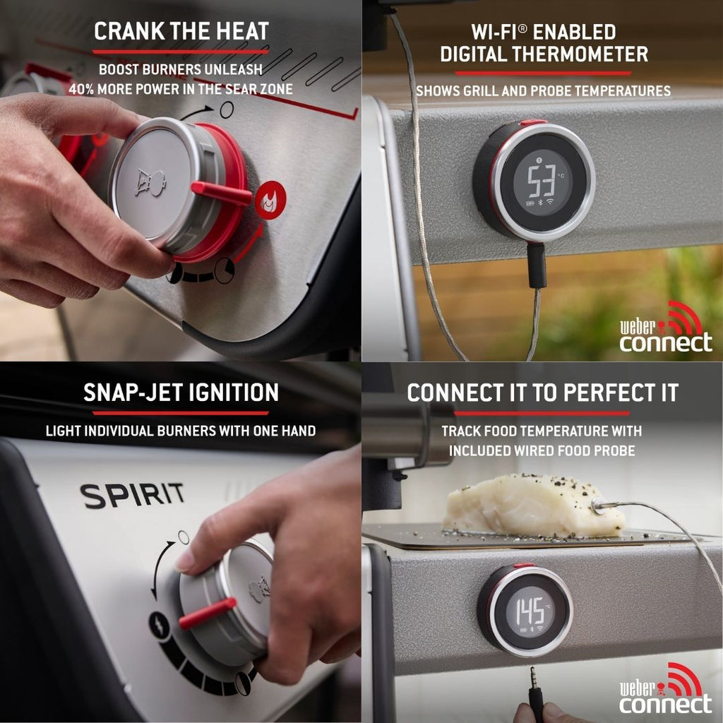 Two Boost burners deliver up to 40 percent more power in the dedicated Sear Zone, creating strong, even sear marks across meat, fish and vegetables. The integrated Wi-Fi-enabled digital thermometer connects to the Weber Connect app, allowing you to monitor temperatures remotely and receive alerts when the barbecue is preheated or your food is ready to turn.